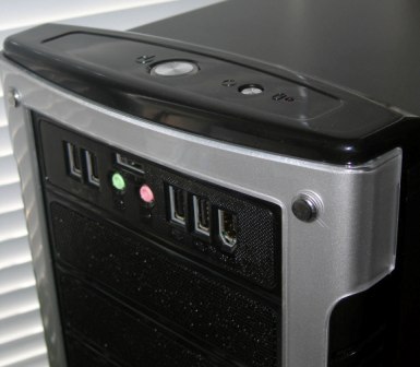 Далее расположена вставка 5,25 дюйма, на теле которой размещено несколько разъемов и интерфейсов. В частности речь идет о четырех USB интерфейсах, разъемах для подключения наушников и микрофона, а также интерфейсах e-SATA и Firewire.